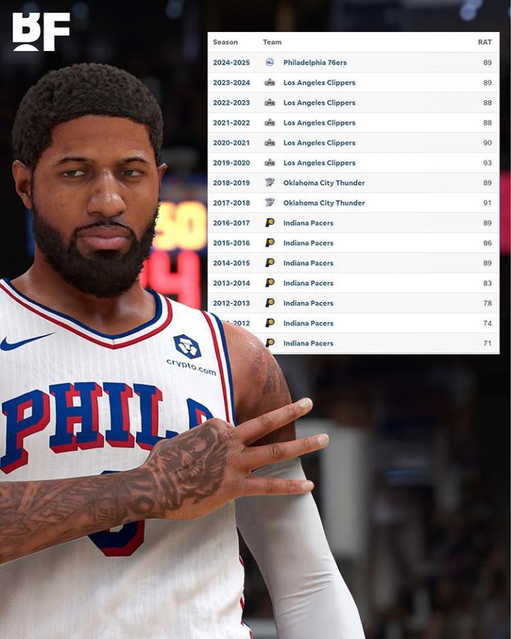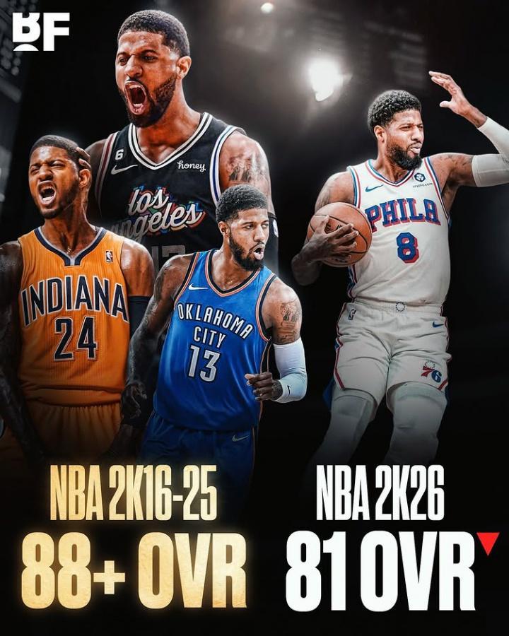 直播吧08月22日讯 2K26近日公布了联盟TOP100能力值,其中76人球星乔治能力值跌至81,排在第92名。